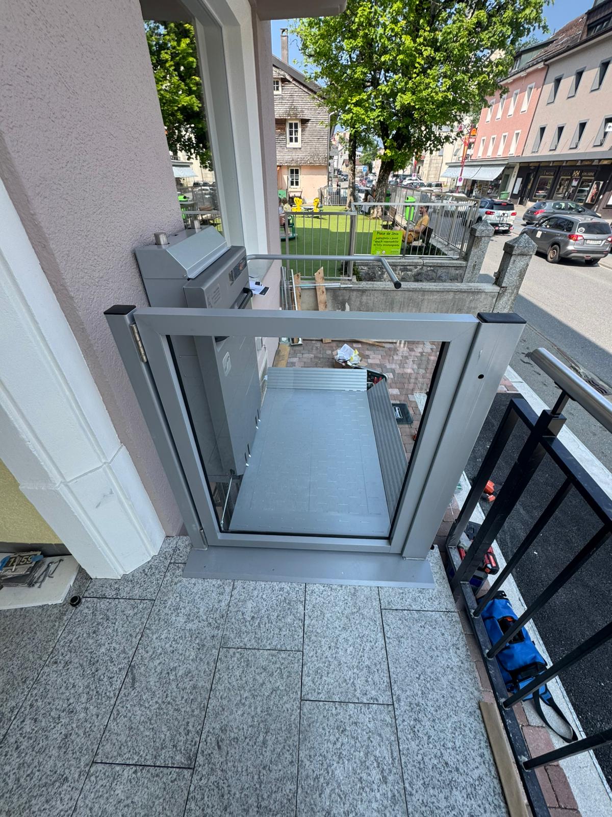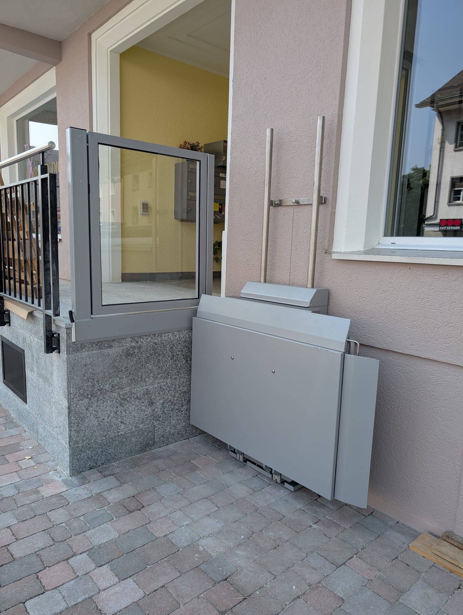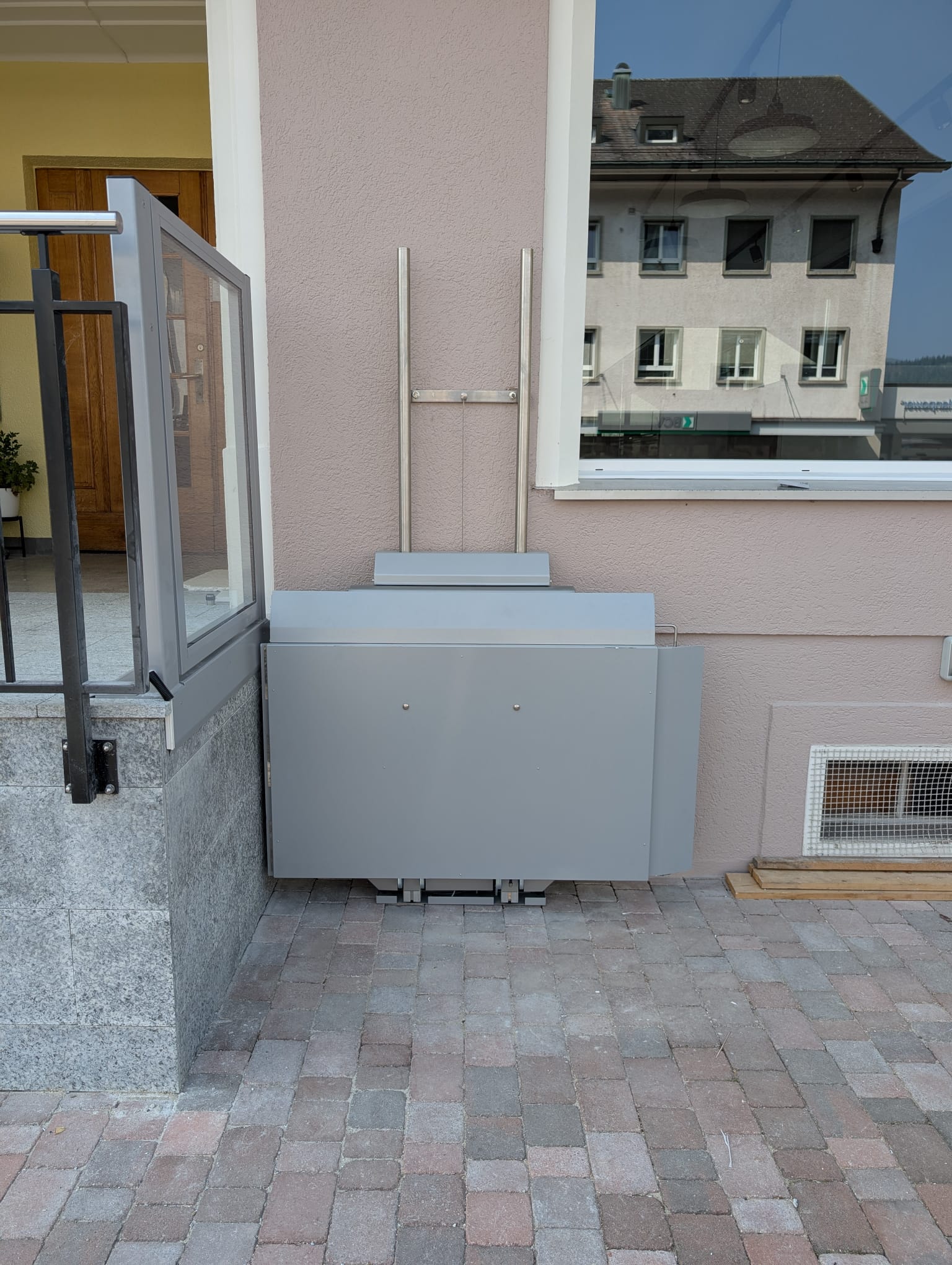 LSM Mobility Plateforme élévatrice Ascendor PLV9 grise installée à l'extérieur d'un bâtiment, offrant accessibilité. La plateforme est repliée, montrant son design compact et sa facilité d'intégration architecturale.