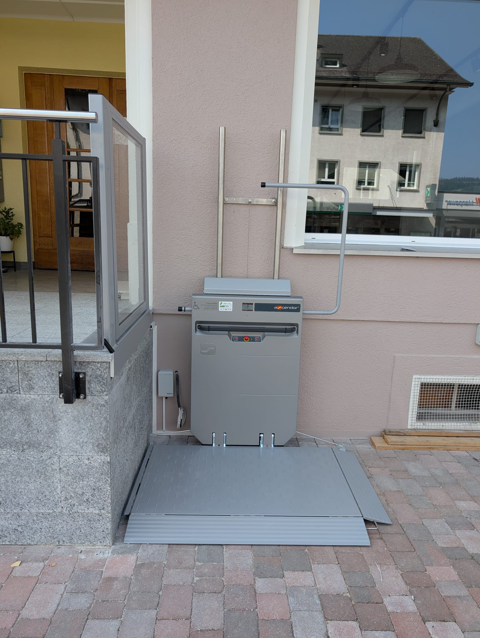LSM Mobility Plateforme élévatrice Ascendor PLV9 grise installée à l'extérieur d'un bâtiment rose pour l'accessibilité PMR. Rampe d'accès en métal et structure sécurisée. Ascendor visible.