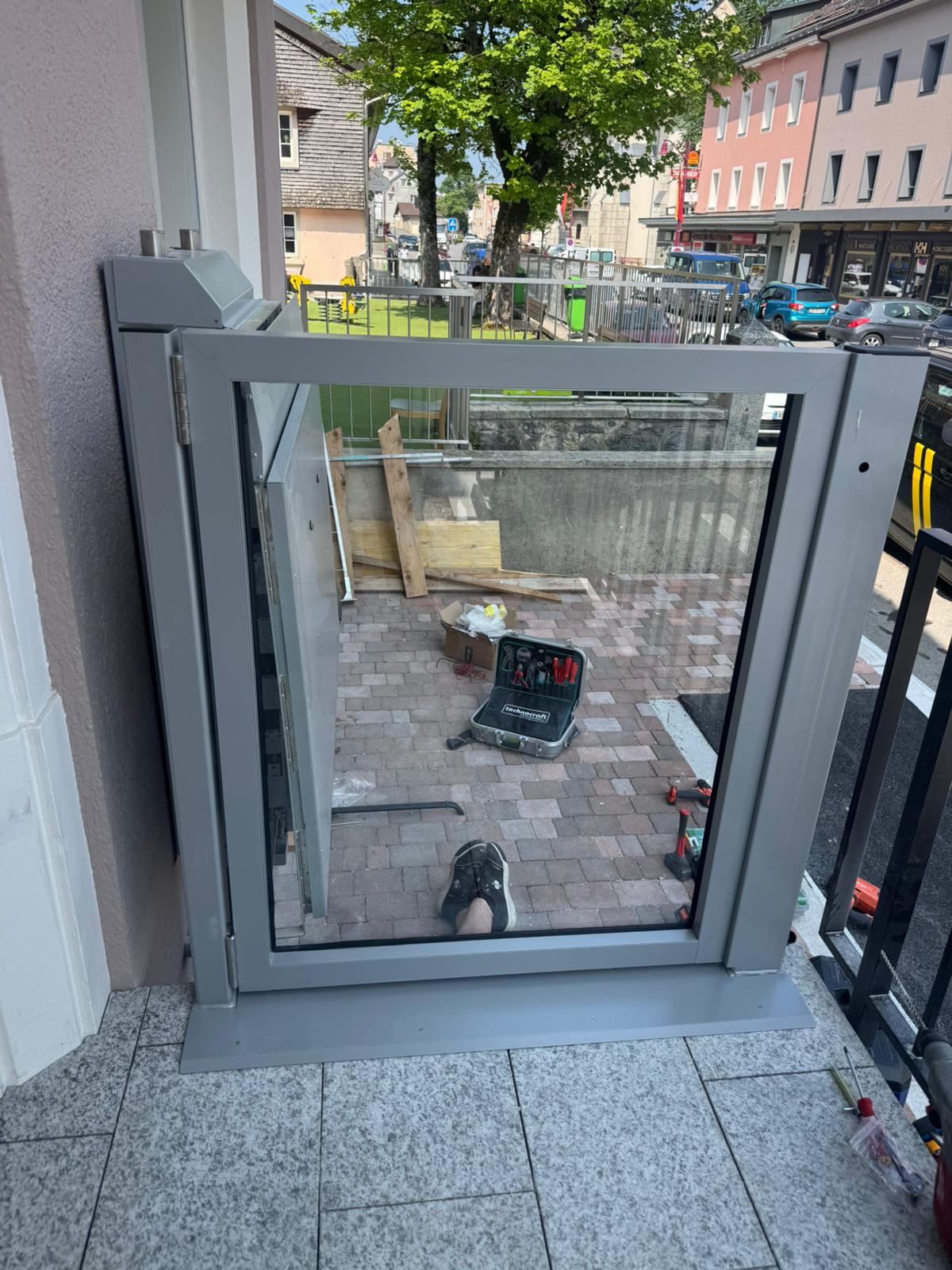 LSM Mobility Plateforme élévatrice Ascendor PLV9 gris clair installée à l'extérieur d'un bâtiment beige, avec une porte d'entrée et une fenêtre reflétant un autre bâtiment. Accès facilité pour personnes à mobilité réduite.