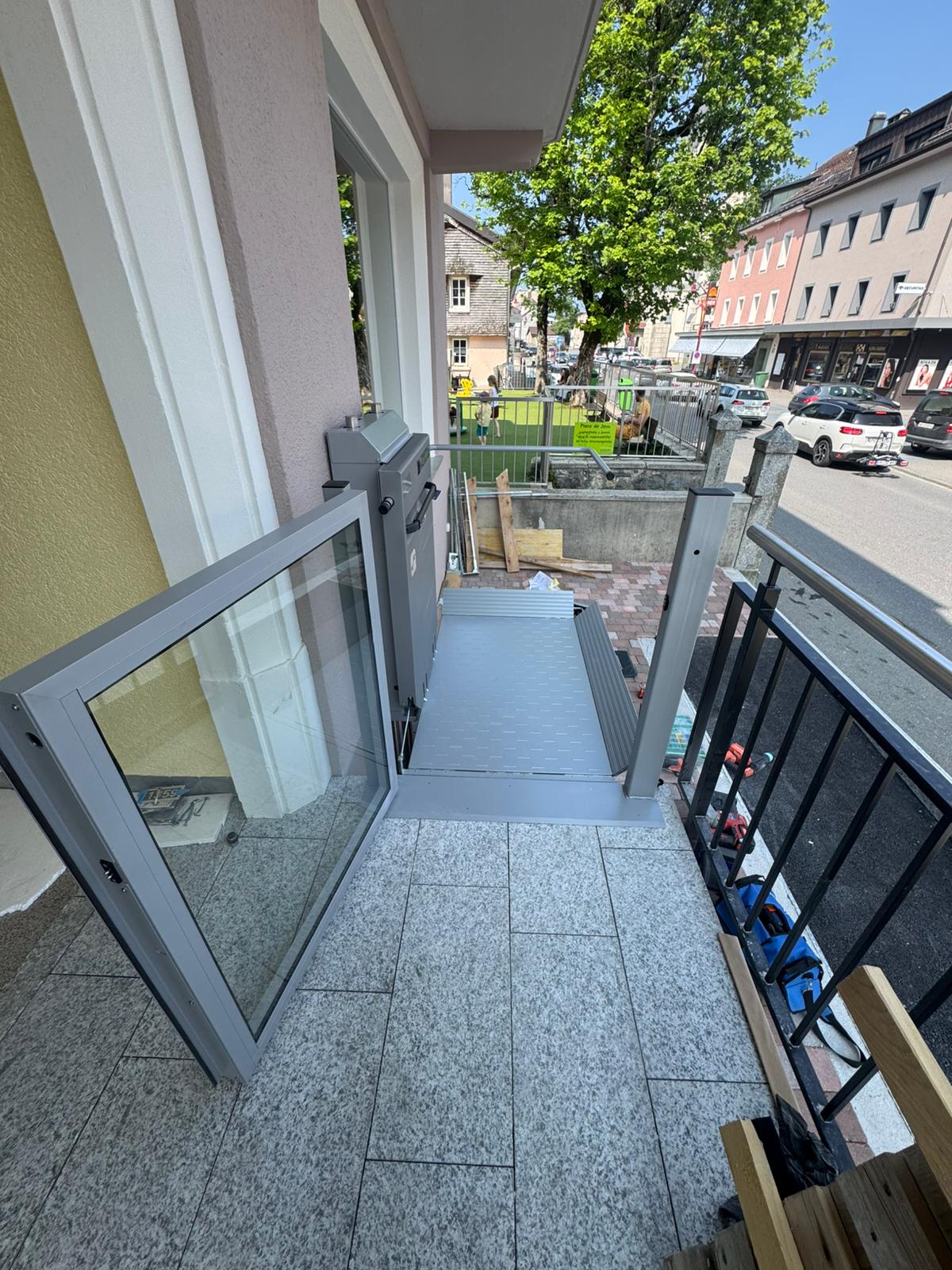 LSM Mobility Plateforme élévatrice Ascendor PLV9 installée sur un balcon, offrant accessibilité dans un cadre urbain pittoresque. Vue plongeante sur la rue animée.