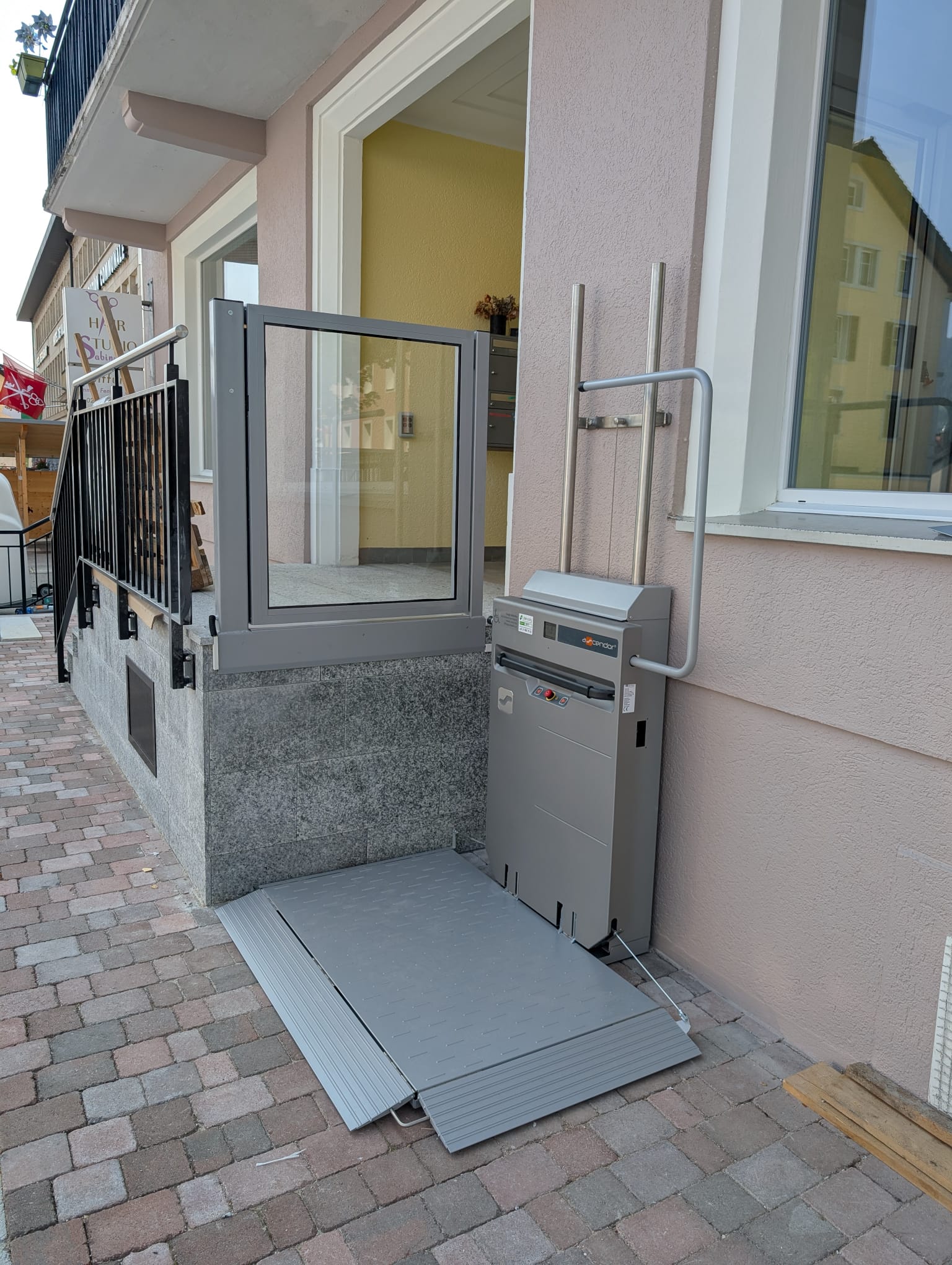 LSM Mobility Plateforme élévatrice Ascendor PLV9 grise installée à l'extérieur d'un bâtiment résidentiel pour l'accessibilité aux personnes à mobilité réduite.