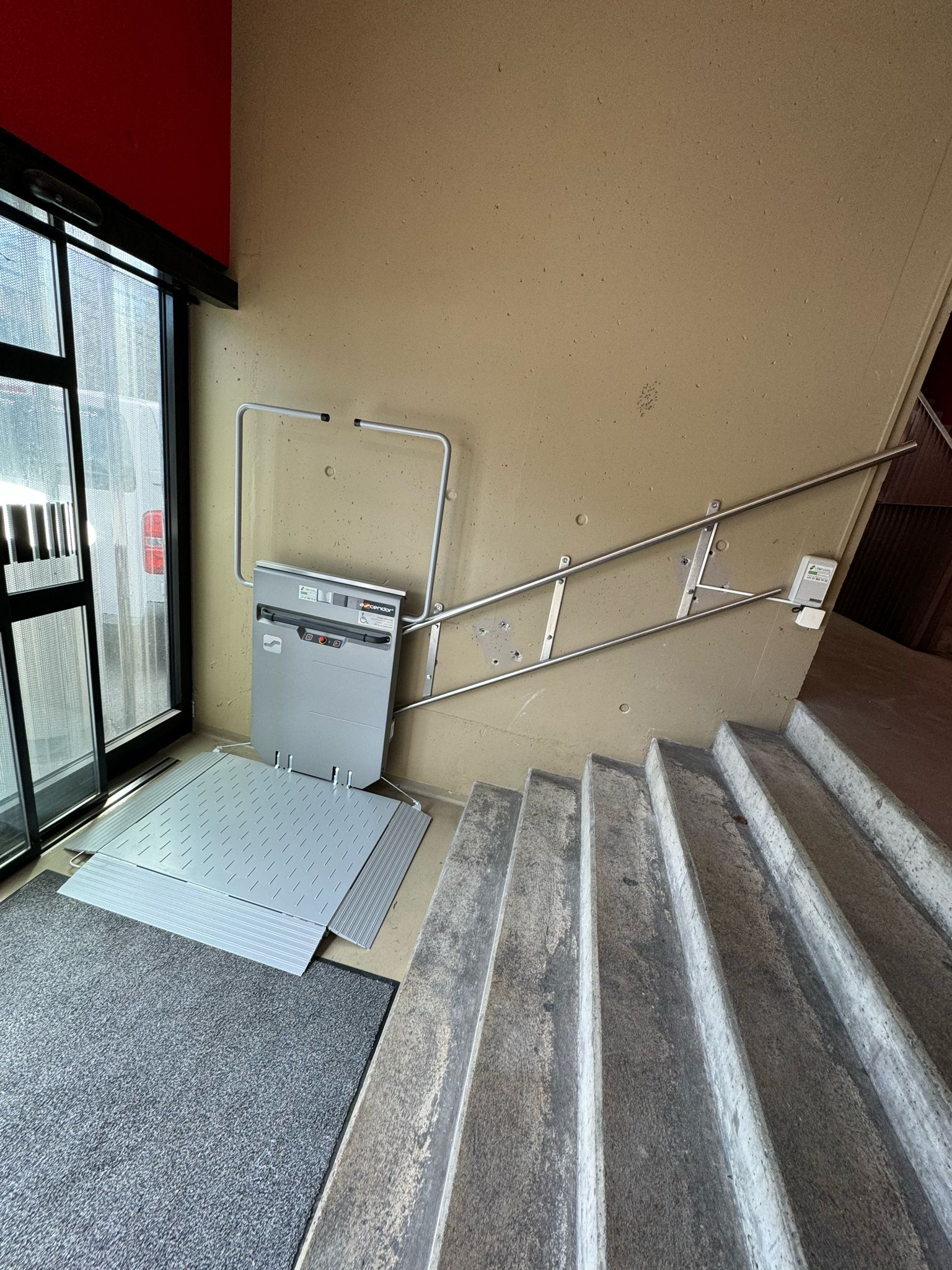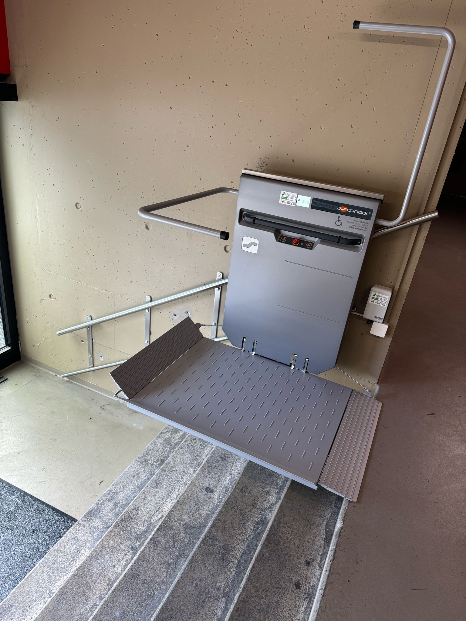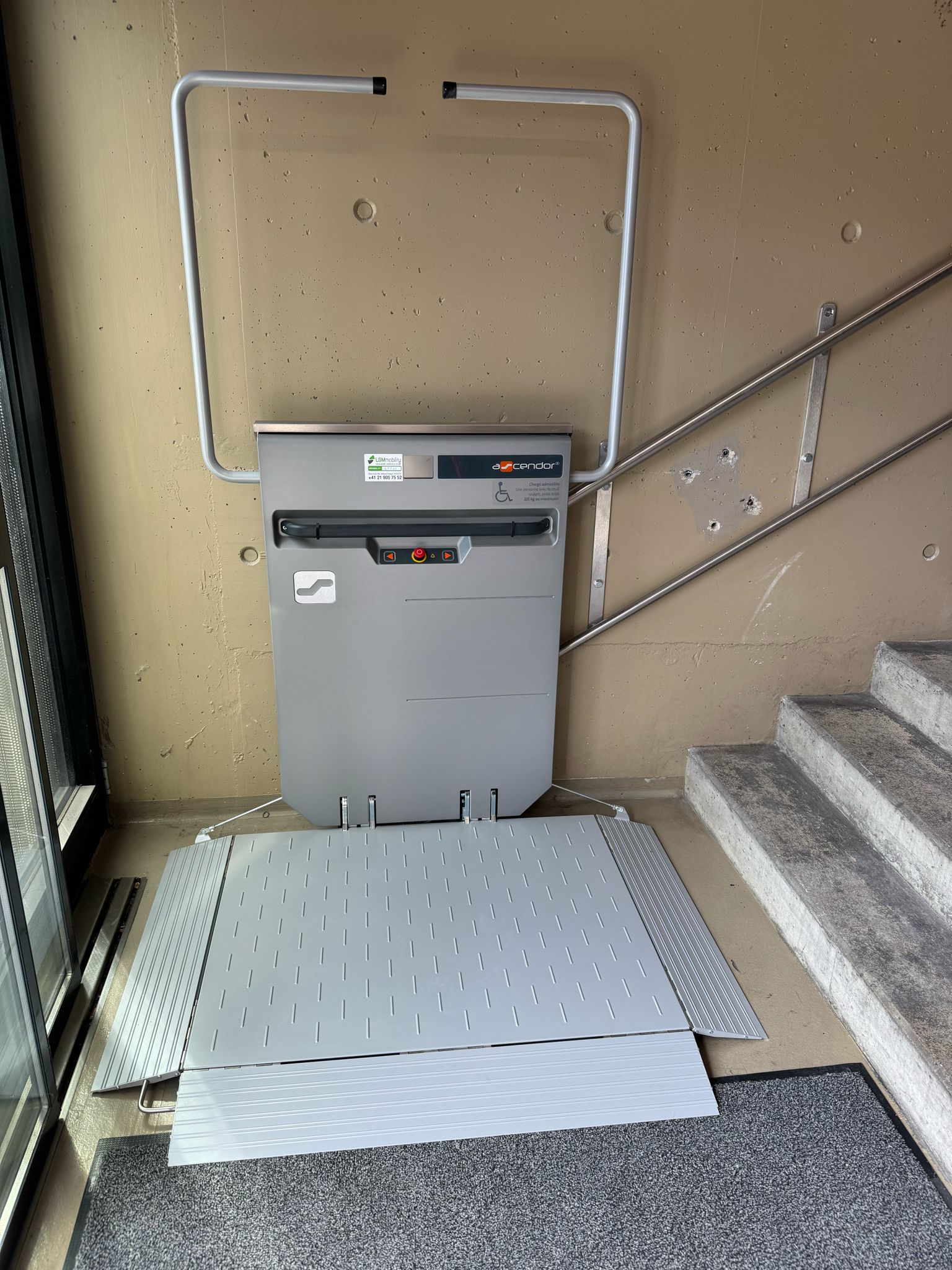 LSM Mobility Plateforme élévatrice pour fauteuil roulant installée près d'une porte vitrée au stade de la Maladière à Neuchâtel. Rampe d'accès gris clair et structure métallique argentée. Ascendor visible.
