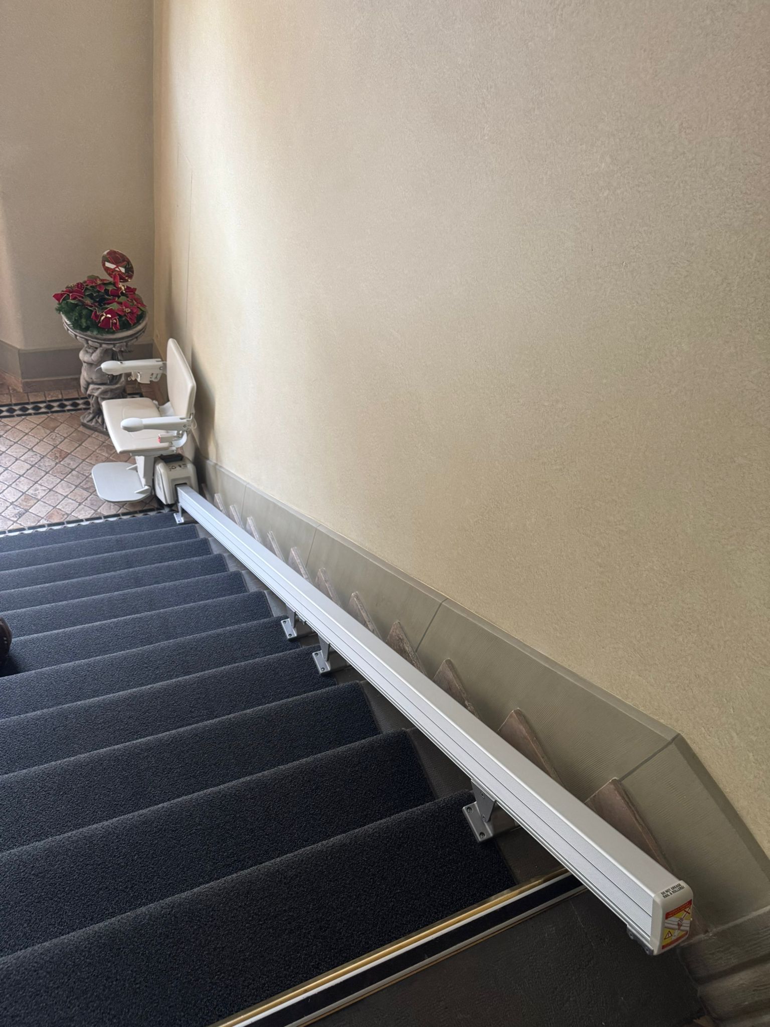 LSM Mobility Siège monte-escaliers Handicare 1100 replié sur un escalier intérieur avec moquette grise. Un pot de fleurs décore le palier.
