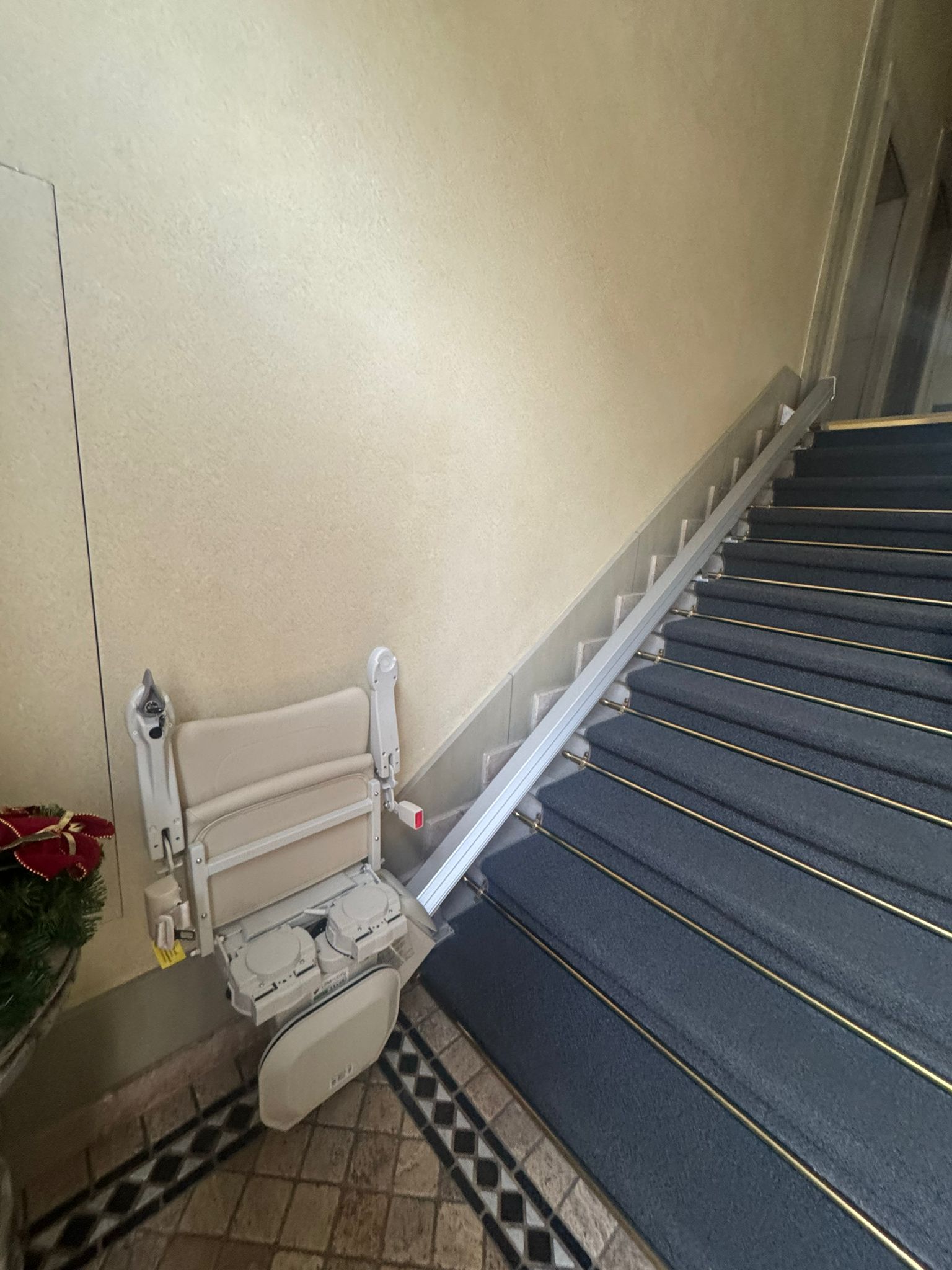 LSM Mobility Siège monte-escaliers Handicare 1100 beige installé sur un escalier avec moquette bleue et rampe argentée. Le siège est replié, prêt à l'emploi, dans un intérieur soigné.