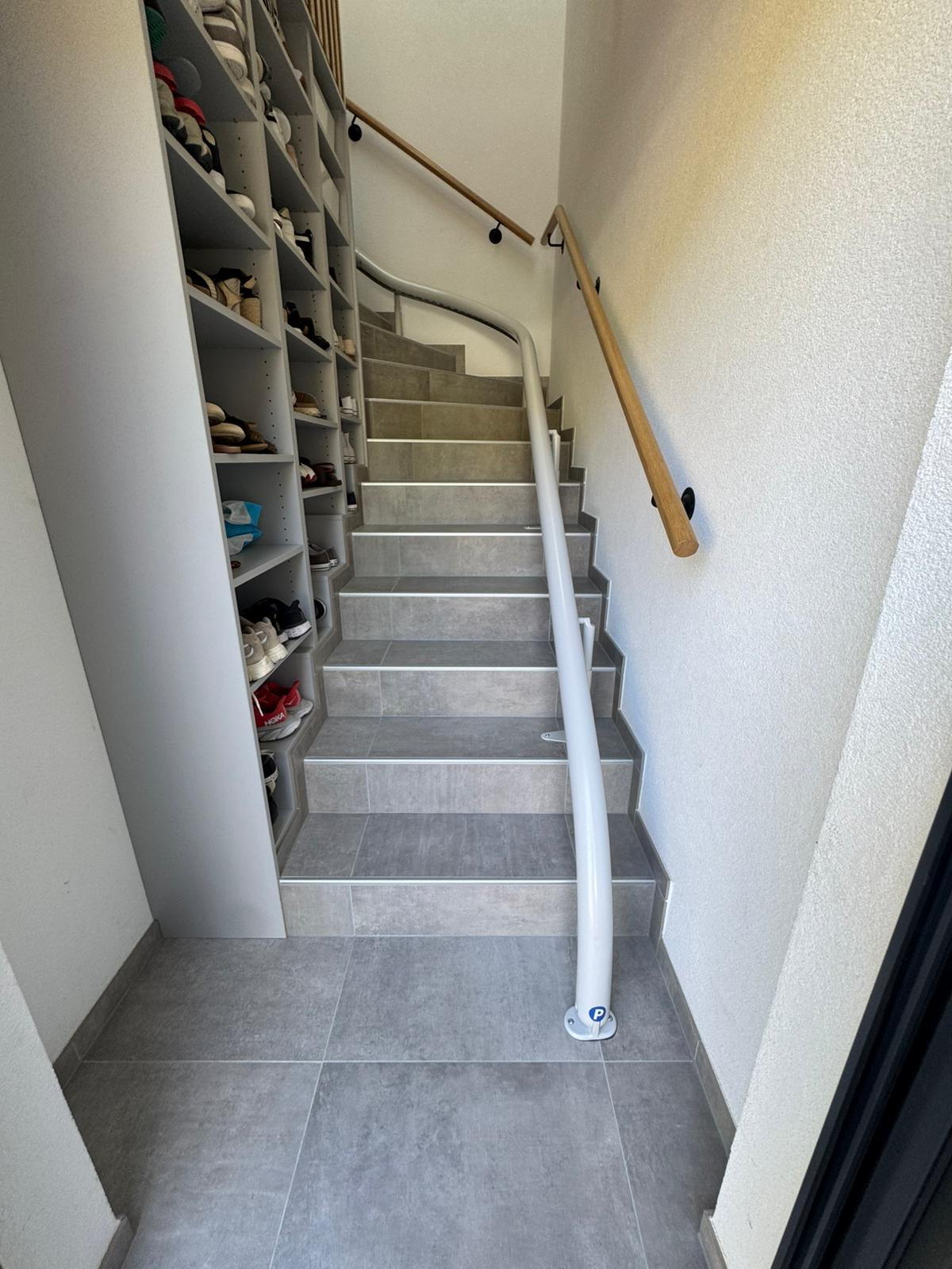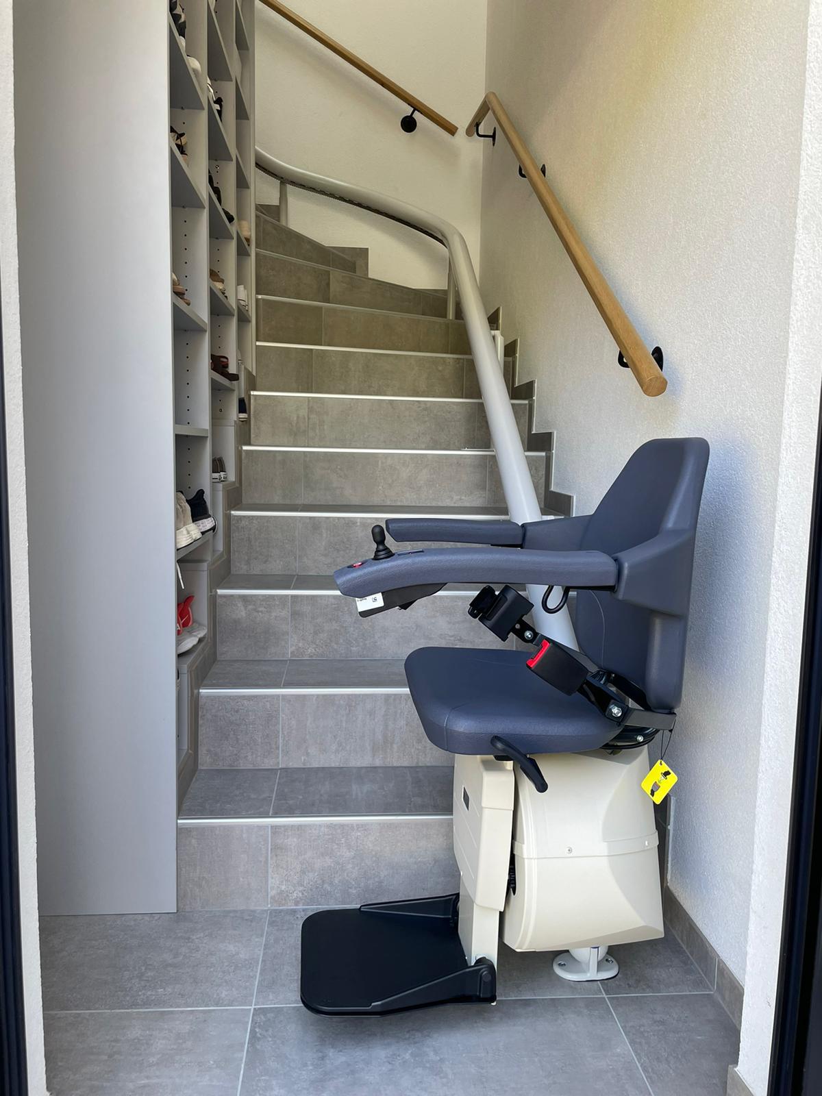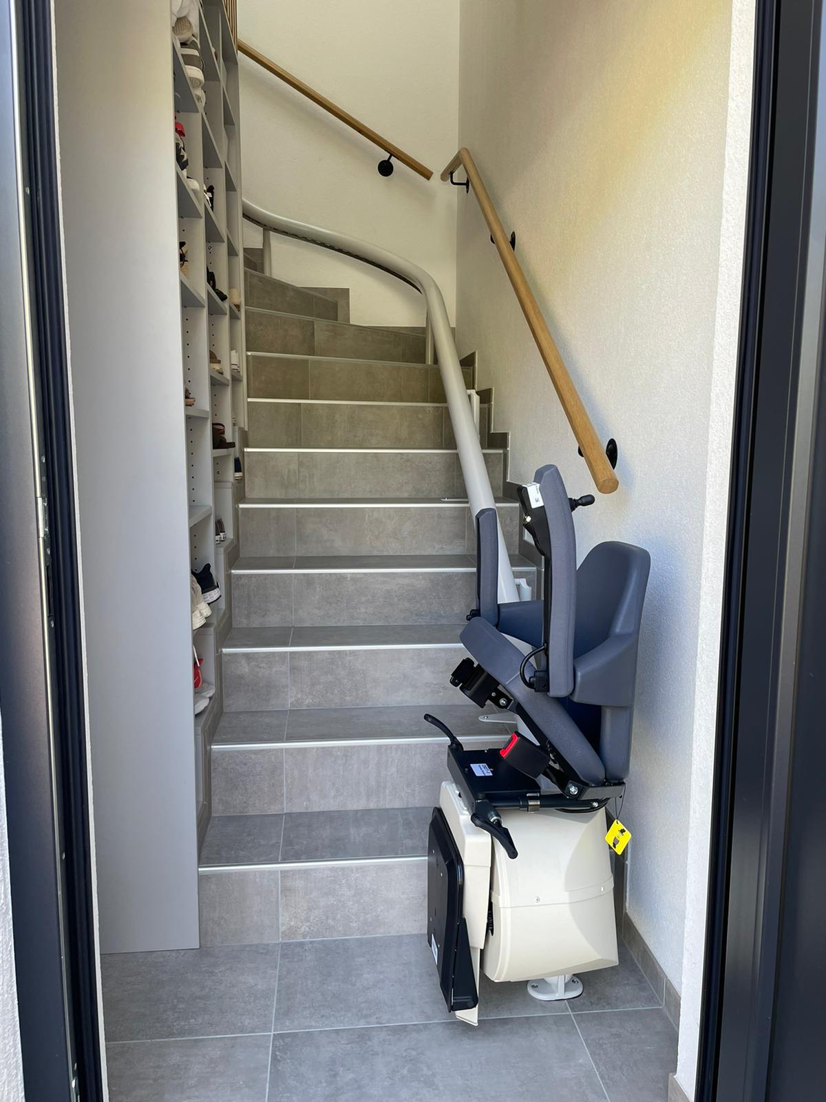 LSM Mobility Monte-escalier moderne gris clair installé dans un escalier carrelé gris. Rail incurvé pour suivre la forme de l'escalier. Placard à chaussures intégré à gauche.