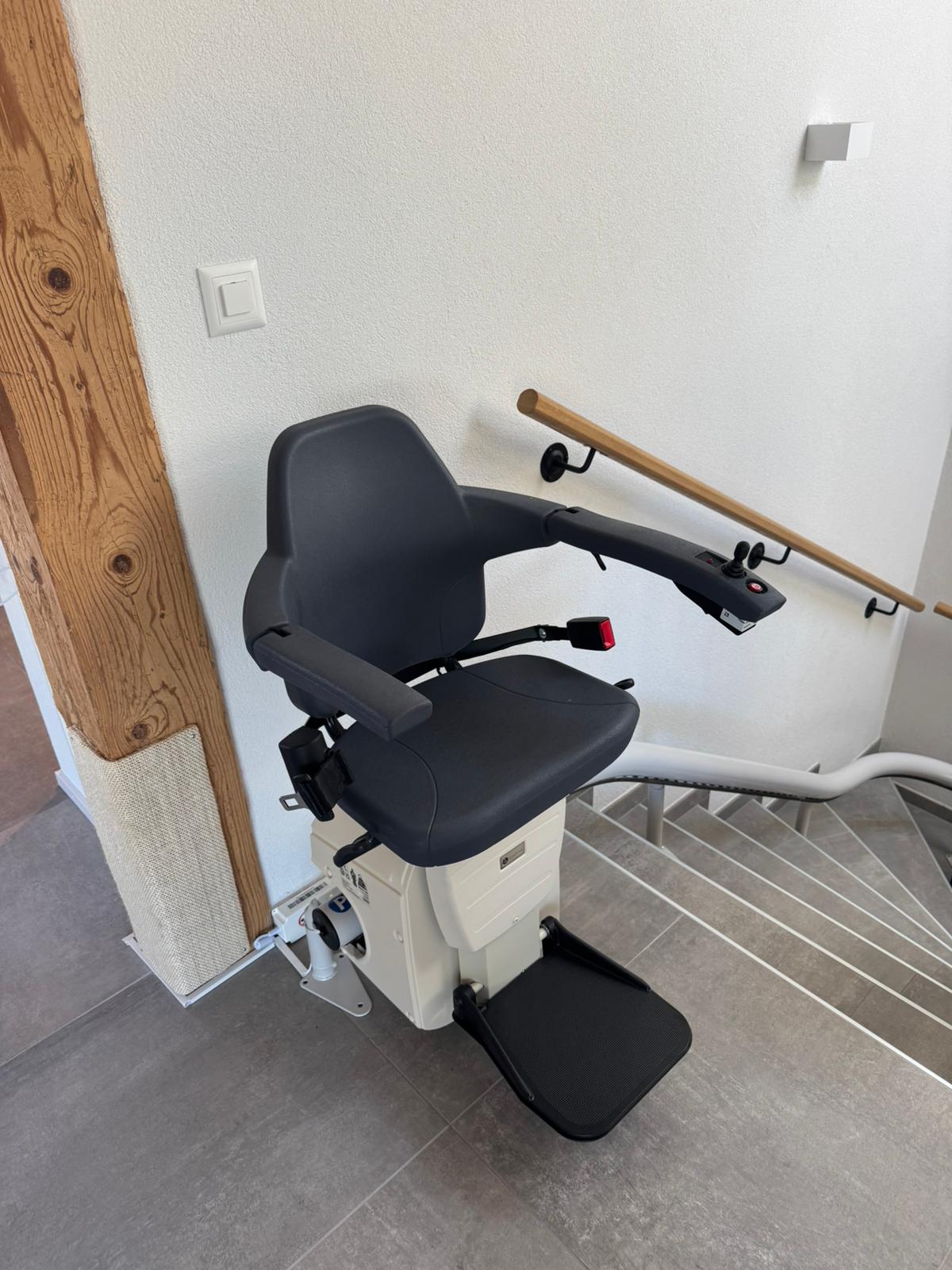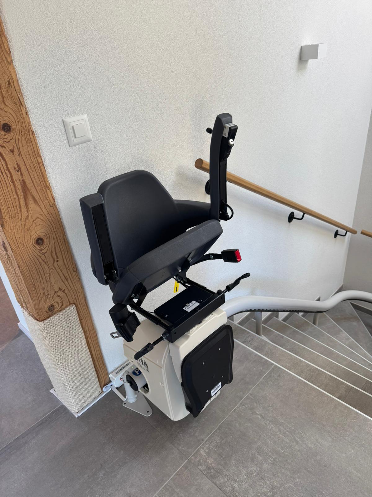 LSM Mobility Siège monte-escalier Handicare Monorail gris foncé installé sur un escalier moderne avec rampe en bois. Le siège est replié et prêt à l'emploi.